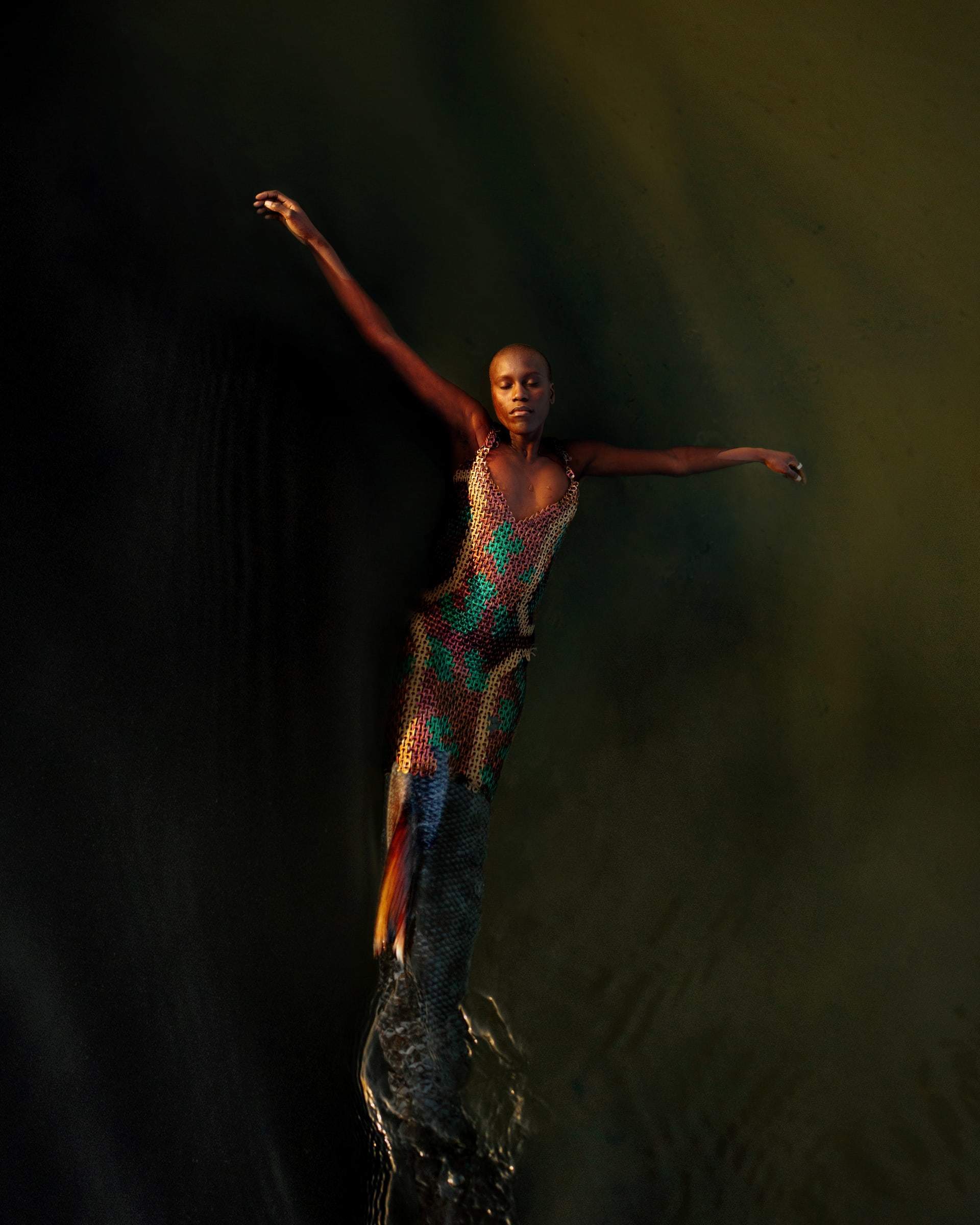 The body of work Drown In My Magic speaks to the melting of body and nature in a illusionary manner, and displays how David plays with digital imagery and manipulation. Shot in Senegal, viewers are faced with Black people who can transform into surreal water creatures. These characters are shown to be emerging from the water. In the same way that the figures blur the human and non-human through their hybridism, their coastal environments exist as transitional terrains, a meeting between land and water.