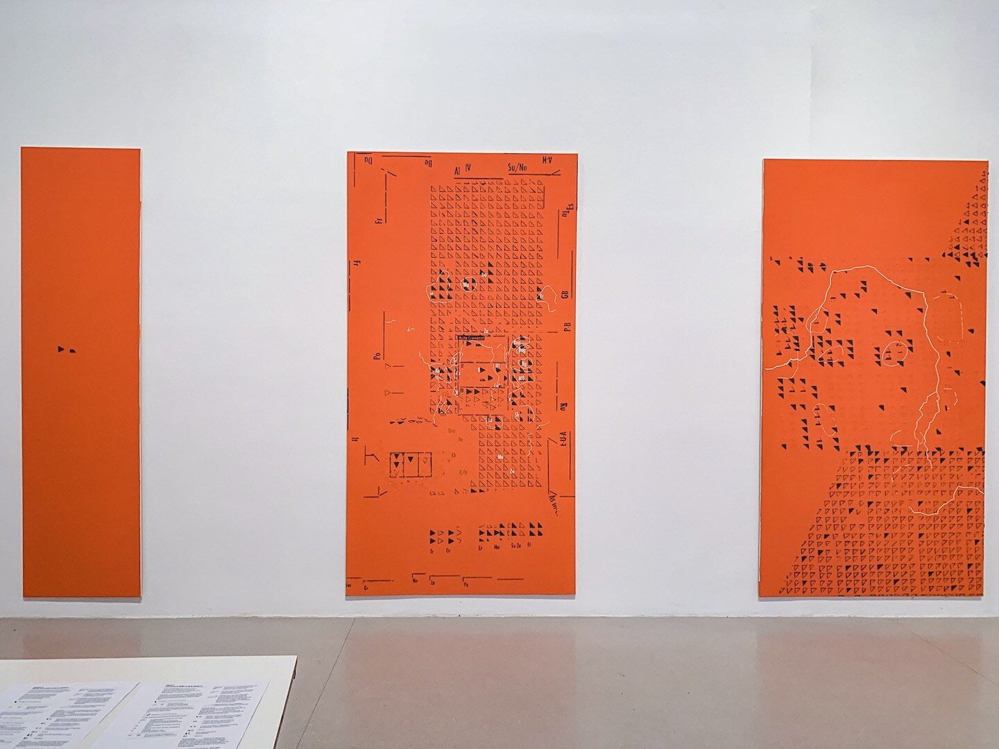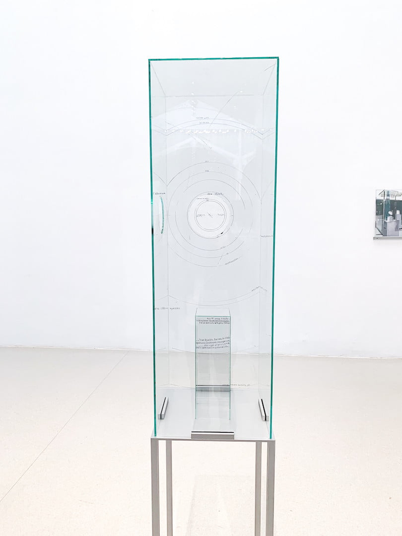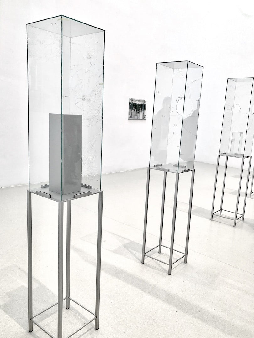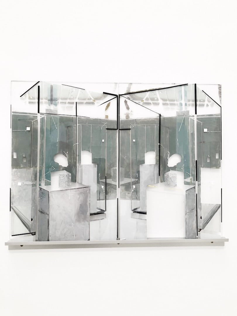 Museum devices are revised in the series Broken Windows (2013–in progress), where the artist cites this ubiquitous support in museums to allude to the decontextualization and fetishism of the ethnographic object, and to the decline of experience, in which these glass structures, painted by Schmidt, remain frames and frameworks through scratches and perforations, referring at once to the colonial practices of plundering and initiatives of resistance and restitution.
