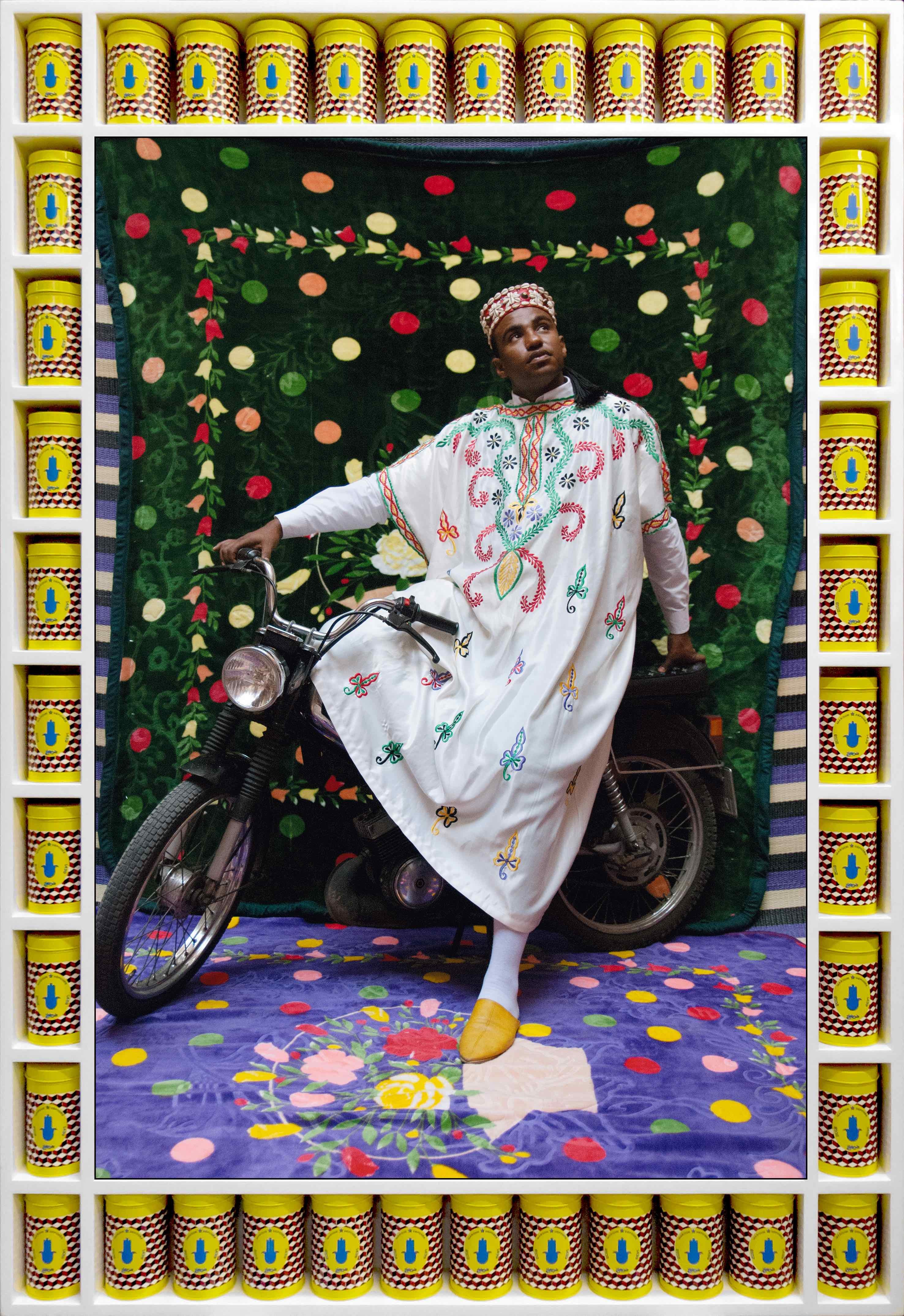 This section of the show continues with two series presented side by side: “Gnawi Riders” and “Kesh Angels”. In the first, Hassan Hajjaj has photographed gnawa musicians from the traditional culture of the same name. All his models are men striking the same pose on motorbikes: with one foot on the ground.