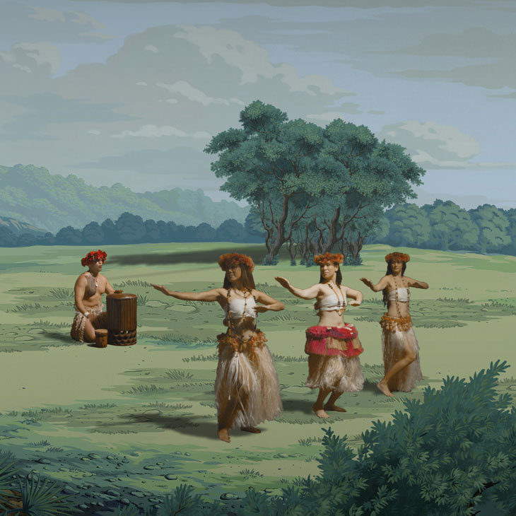 Behind the figures is an Arcadian landscape, amalgamations of Hawai’i, Tahiti, Aotearoa New Zealand and other locations in the vast Pacific region. This imaginary space is more reflective of how the British viewed the peoples they encountered, and therefore the British, rather than the peoples and cultures themselves.