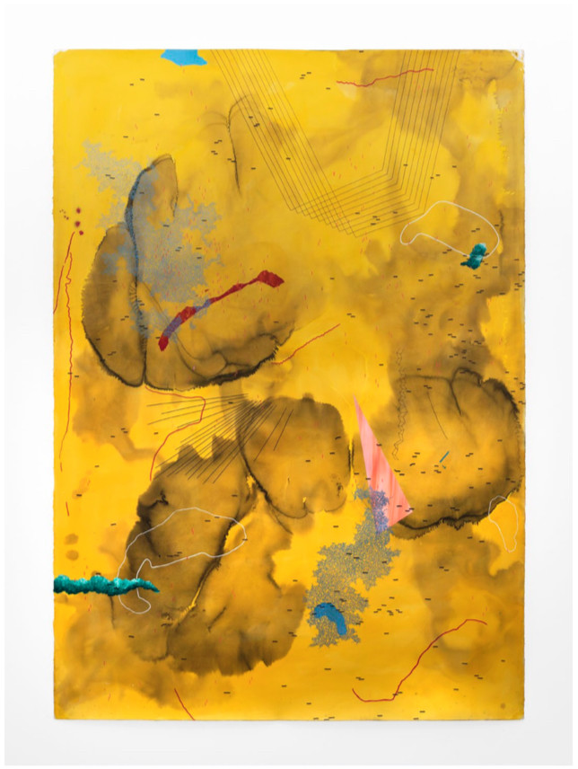 Mongezi Ncaphayi ’s paintings, largely minimalist, vacillate between collages and painting using the wet-on- wet technique. Wet-on-wet refers to a procedure based on water based pigmentations, whereby a watery pigment is applied on top of another in a semi controlled way, causing a complex and rhythmic orchestra of painterly effects. These images tend to resemble a topographic layout, a blurred form of mapping out. Here the art object becomes a cartographic sign in which we trace the labyrinth of self-developed shades, rendered elegantly and seemingly effortlessly. This is something Mongezi Ncaphayi extends on in the current exhibition.