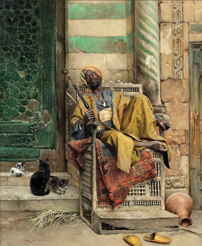 The man in Deutsch’s painting wears a traditional striped qumbaz beneath a heavier outer robe. To those familiar with Deutsch’s art, the appearance of these specific blue, red, and yellow-gold garments would not have been surprising, as they were repeated often in his oeuvre and may have been drawn from the artist’s own collection of textiles and exotic goods. In his right hand, the man grasps a goza, or pipe, featuring a large brass bowl carved with Islamic designs. Built for portability and meant to be held rather than set upon the ground, this somewhat archaic form of Egyptian hookah is distinguished by a stiff bamboo stem rather than a flexible hose. The direct flow of smoke from bowl to mouth that this construction allows made it a particular favourite among smokers of tombiek, ajamy, and other traditional and fragrant tobaccos such as jurak and zaghloul, as well as among 19th century enthusiasts of hashish and stronger drugs. The man’s posture here is relaxed and informal and his sideways stare is unfocused and blank. Lost in thought – or perhaps in the effects of the unspecified substance that he smokes – Deutsch has created an unlikely protagonist in this otherwise characteristic work, sprawled languidly upon his mashrabiyah, or turned wood, throne.