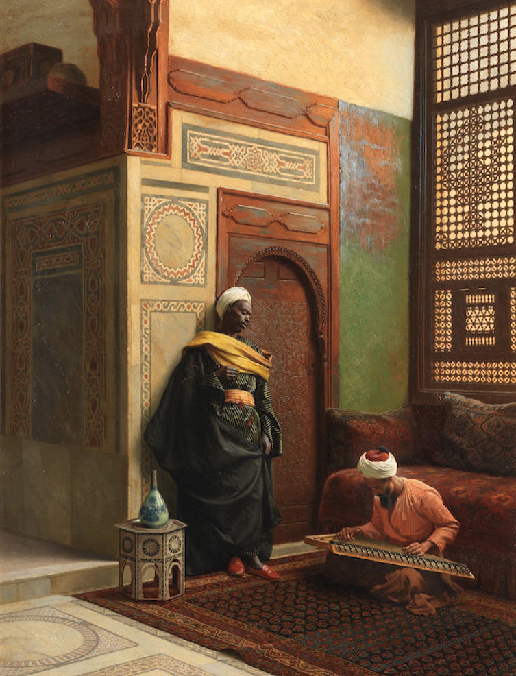 In The Qanun Player,1903, Ludwig Deutsch creates a work that is both instantly familiar and entirely new. A bearded man, seated cross-legged upon a carpet on the floor, plays the qanun, a traditional stringed instrument indigenous to the Middle East. He is observed by a second Arab figure, leaning against an intricately patterned wall. The room itself is rich in ornamental detail, with colourful inlaid stonework, elaborate wooden carvings, and an enormous mashrabiyyah window, through which the soft glow of sunlight streams. The mood of Deutsch’s picture is soothing and subdued; this is a different kind of Orientalism than what was offered by his peers, one in which drama and eroticism have no place.