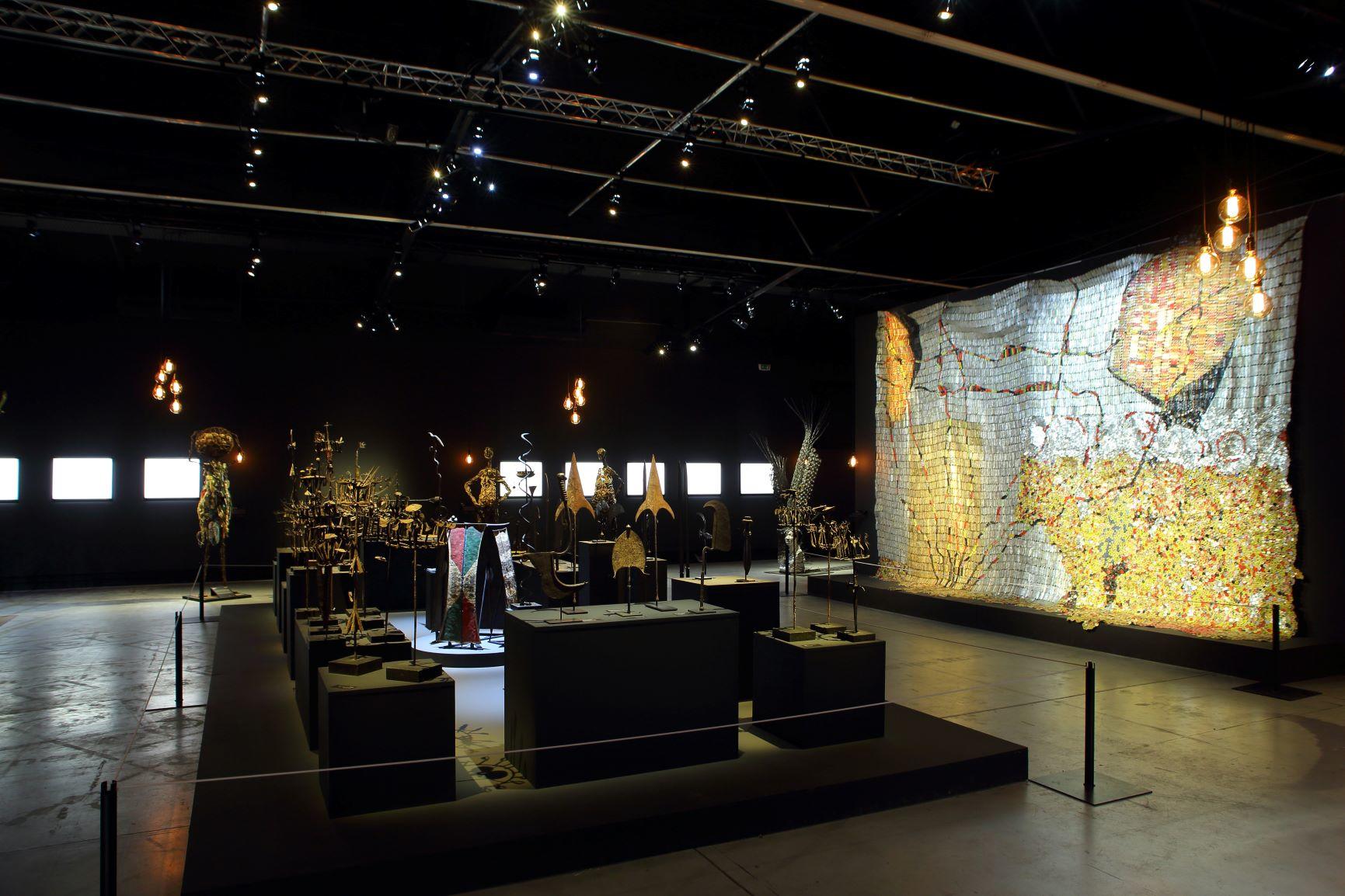 The relationship between the ancien and the modern is complemented by the recent iron sculptures by two young Beninese artists invited for a creative residency at the Blachère Foundation earlier in the year, Marius Dansou and Rémy Samuz. Drawings by Soly Cissé, photographs by J. D. Okhai Ojeikere, prints on Dibon by Mansour Ciss, but also Confluences of El Anatsui, flamboyant wall sculpture made of strips of aluminium and copper wire that refers to Ghanaian Kente textiles, and Dexu Adüna dʼAlexis Peskine, a deep portrait of a young man literally nailed to black wooden boards, constitute a discreet resonance to the iron sculptures, old and contemporary, of the exhibition