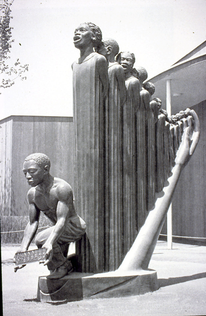 De l’Œuvre d’Augusta Savage, l’histoire a notamment retenu « The Harp » (1939), représentant une chorale d’enfants noirs. Commandée par le comité de l’Exposition Universelle de New-York de 1939 pour la somme modique de 360$, l’œuvre de 5 mètres de hauteur est réalisée en plâtre peint. Elle est l’interprétation plastique de l’incipit du poème « Lift Every Voice and Sing » [Que chaque voix s’élève et chante] des frères James Weldon et John Rosamond Johnson composé en 1900 – poème immédiatement qualifié par la communauté noire d’« hymne national des afro-américains ».