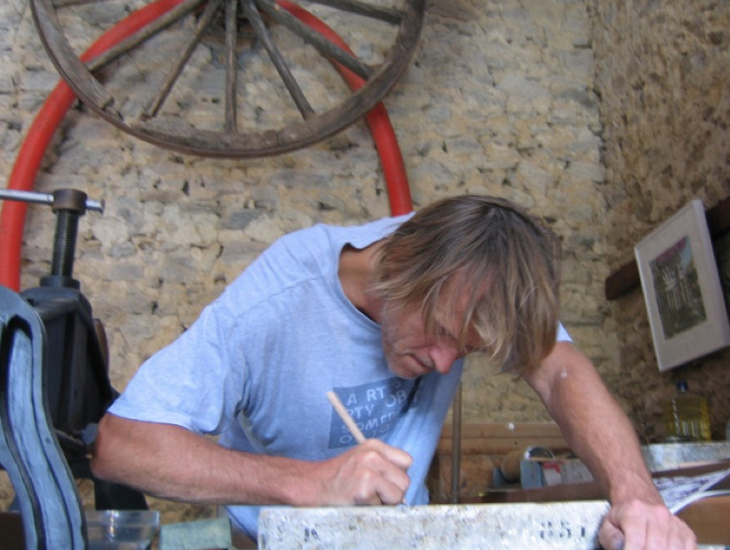 Francis van der Riet, artiste lithographe, constitue peu à peu un atelier idéal, mêlant presses et outils de pointe. Il invite des artistes en résidence à l’atelier pour produire des tirages lithographiques.