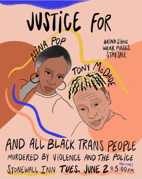 Sarah Wasko est illustratrice et designer. Son illustration crée pour rendre hommage à Nina Pop et Tony McDade a été utilisée pour appeler à manifester pour les personnes LGBTQT. Tony McDade était un transsexuel afro-américain de 38 ans, tué par balle dans le complexe d’appartements Leon Arms par un officier du département de police de Tallahassee. Quelques semaines avant la mort de McDade, Nina Pop, une femme noire transsexuelle de 28 ans, avait été assassinée dans son appartement de Sikeston, dans le Missouri. Son assassin a été arrêté et inculpé et se trouve en attente de procès. Pop n’est pas morte aux mains de la police, mais son meurtre semble avoir été autorisé par le même manque de conséquences pour la violence contre les Noirs et les homosexuels noirs qui a coûté la vie à McDade et Floyd.