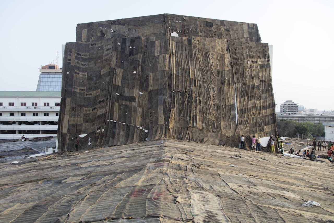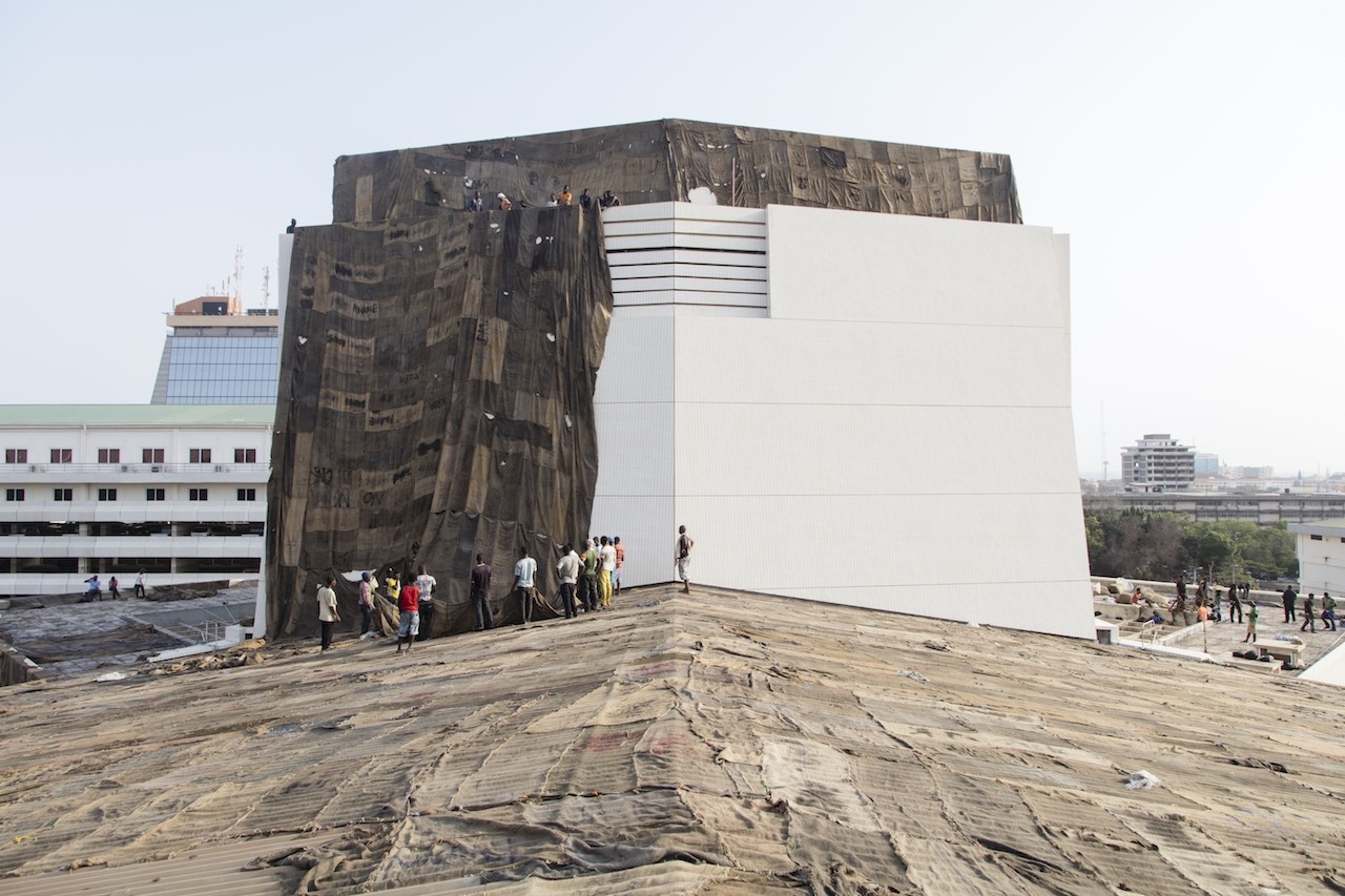 Ibrahim Mahama, Malam Dodoo National Theatre, 1992-2016, National Theatre of Ghana, Accra, 2016. Image courtesy of the artist and White Cube, Hong Kong, London
