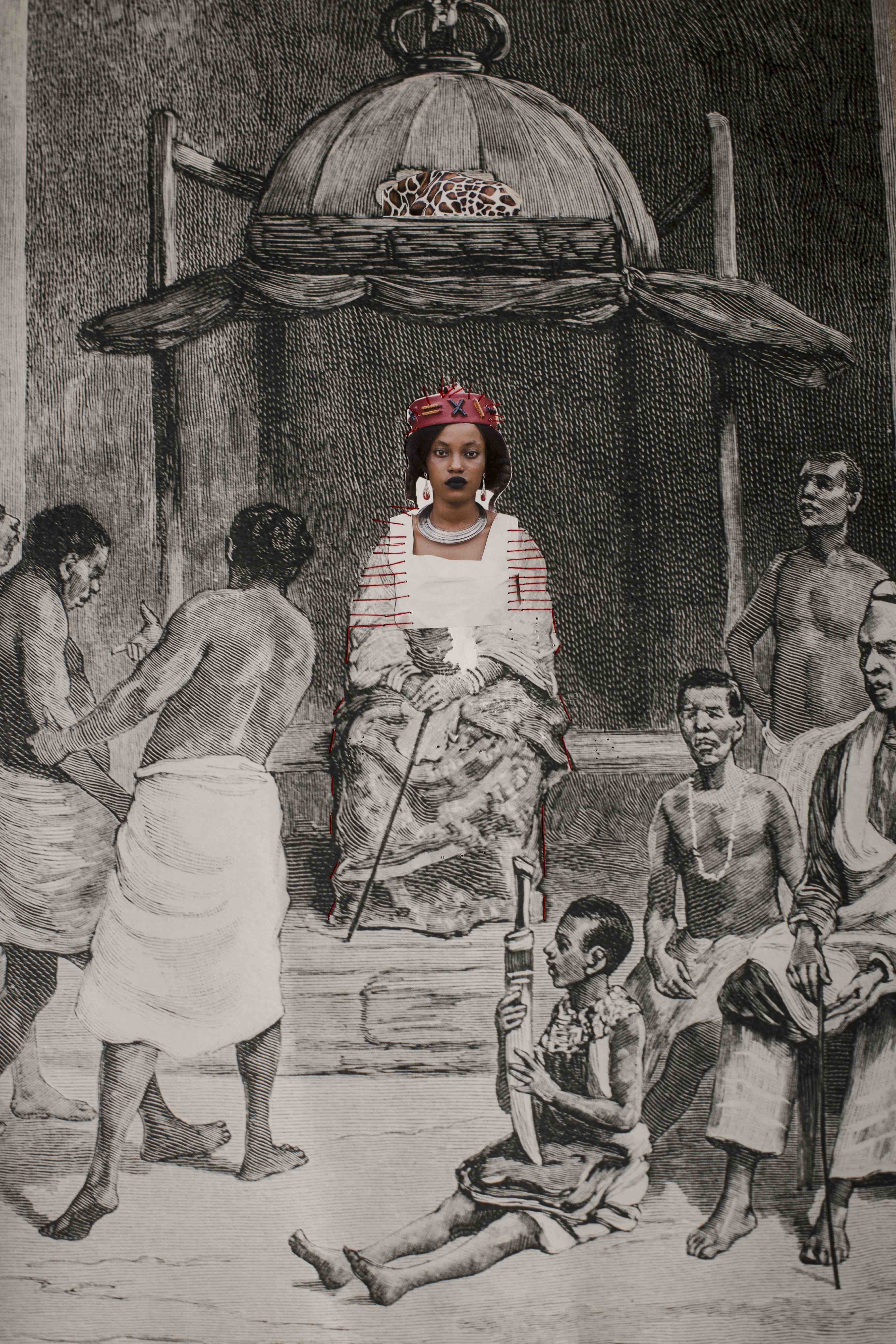 Cette dichotomie, Ishola Akpo nous la livre également dans la série «Traces d’une reine ». Elle est représentée ici par le fil rouge cousu des treize collages de photographies et d’images d’archives, qui révèlent le pouvoir et la gloire oubliés des reines en Afrique. L’artiste se plait à opposer l’aiguille, matérialisant la résistance des Reines, à la fragilité de leur pouvoir incarnée par le papier.