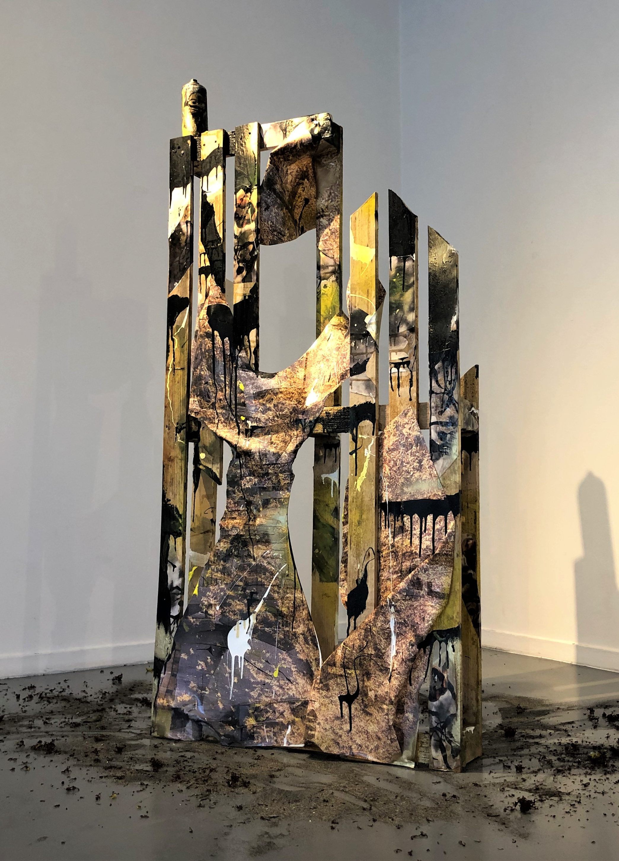 L’installation de l’artiste se présente sous la forme d’une explosion de l’espace avec de nombreux visuels sur les murs et au sol qui se font écho. « Je cherche la possibilité d’une déstabilisation visuelle. Je veux que le public ressorte en ayant créé son propre paysage narratif. Après la tempête, il y a toujours un nouveau souffle », rassure Louisa Marajo avec son immersion dans un chaos total.