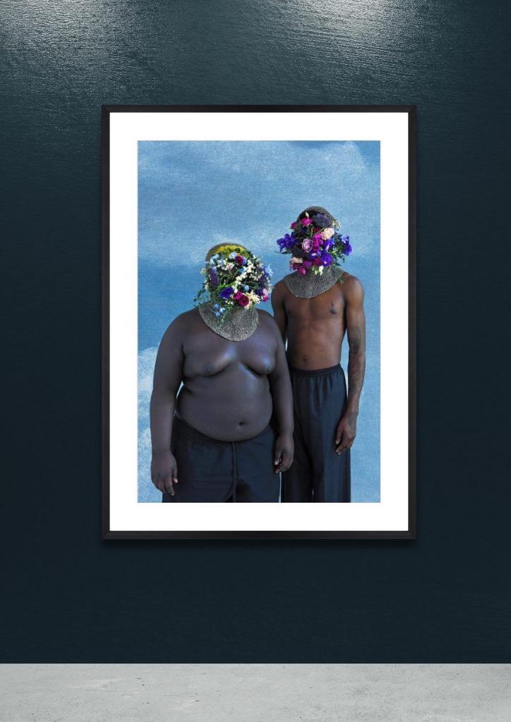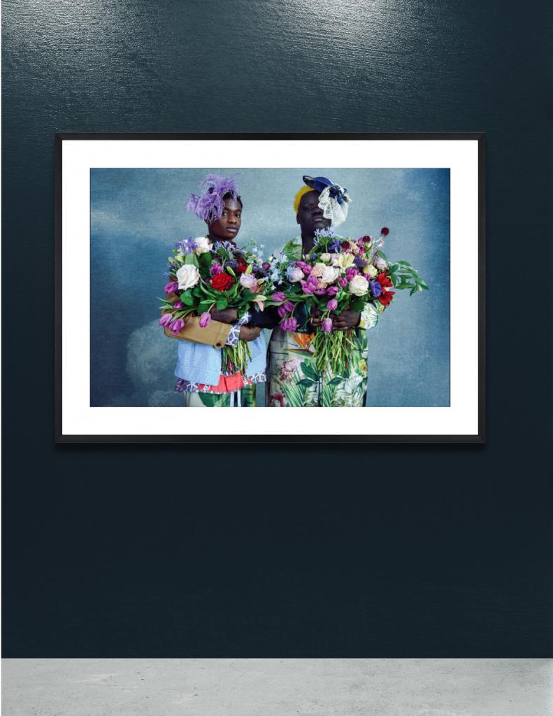 Dans son œuvre Fresh from the garden of Compton, Lamrabat a habillé ses sujets apparemment masculins dans une collection très originale de Dolce & Gabbana – un chapeau violet à plumes, une mitre marine décorée de dentelle crème – tandis que chaque figure tient un grand bouquet de fleurs assorties. Ici, à travers la variété infinie que Lamrabat nous a présentée en faisant abstraction du masculin et du féminin, nous sommes confrontés à une image qui rend impossible l’émergence d’un sens et d’une vision uniques.