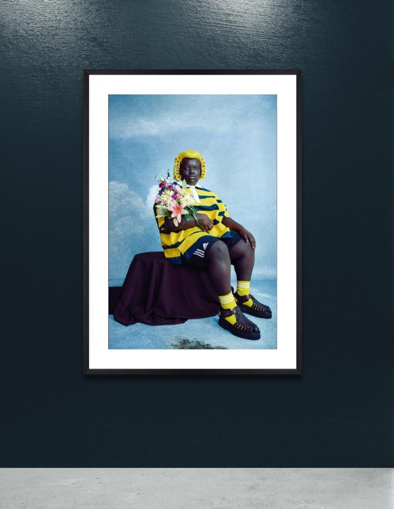 Ici, dans l’œuvre intitulée Brozart, par exemple, nous voyons un sujet habillé à la mode sportive Adidas – prétendument la référence du monde contemporain en matière de standing ; en contraste frappant, il porte une perruque de juge teinte en jaune – un ancien symbole de l’aristocratie reflétant son statut social élevé. Bien que les symboles présentés ici puissent avoir la même signification – une affirmation de classe et de statut – ils sont issus d’époques, de lieux et de sociétés très différentes, et Lamrabat les revisite pour les adapter à son récit : au Mousganistan, nous sommes tous de cette classe.