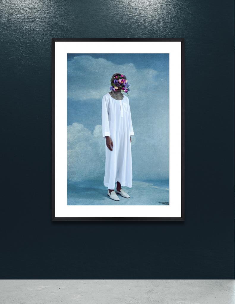 Brozart est également assis sur un socle drapé d’un tissu violet foncé ; il porte un bouquet de fleurs dans un bras tandis que l’autre repose légèrement sur son genou. La pose est symbolique du portrait traditionnel ; tout au long de l’histoire de l’art, nous avons vu des individus puissants et majestueux représentés de cette manière – et c’est peut-être là aussi que l’œuvre de Lamrabat trouve sa valeur. Le ciel sans limite derrière le sujet de Lamrabat – qui figure dans chaque portrait de Sir Mix A Lot – est une référence directe au ciel nuageux dans Le Fils de l’homme (1964) de l’artiste belge René Magritte ; pourtant, ici, il n’y a pas de ligne d’horizon, les sujets ne seront pas cloués au sol